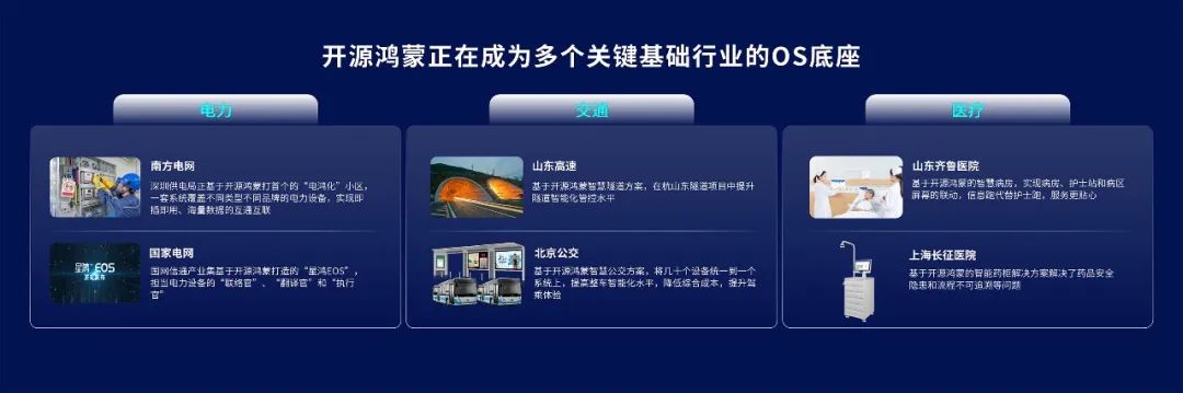 在电力行业,开源鸿蒙可以支持各设备间即插即用、海量数据互联互通,填补国内电力行业物联网操作系统领域的空白。在金融行业,开源鸿蒙可以实现多终端业务联动,有效提升金融服务的便捷性和智能化水平;在具身智能领域,开源鸿蒙可以助力人形机器人全面适配沙地、草地、障碍等地形,并支持20cm跳跃高度,可实现人形机器人多场景智联应用;在智能家居领域,开源鸿蒙可以支持多种智能设备的互联互通,实现智能家居场景下的无缝控制和管理;在医疗行业,开源鸿蒙可以支持可穿戴设备与医疗设备的互联互通,实现健康数据的实时监测和分析;在交通行业,开源鸿蒙可以支持车载设备与其他智能设备的互联互通,提升交通出行的便捷性和安全性。