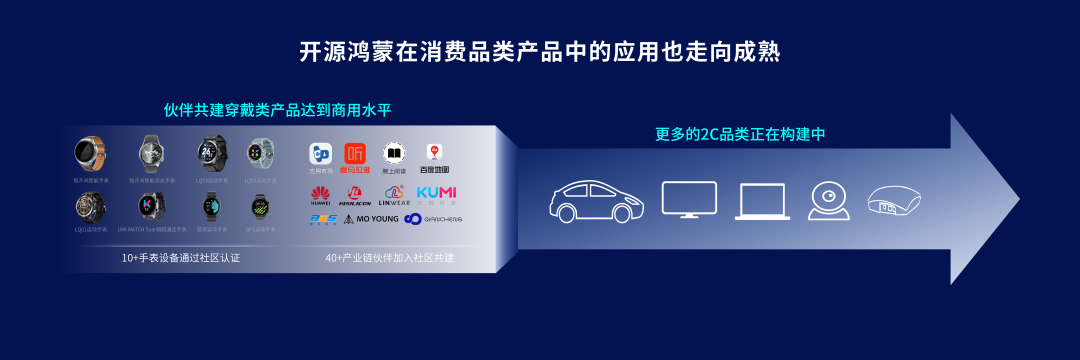 目前,开源鸿蒙社区已有400余家伙伴,累计350余家厂家的1000余款产品通过兼容性测评,不仅在金融、超高清、航天、教育、商显、工业、警务、城市、交通、医疗、电力等多个关基行业取得了突破性进展,还在消费品类产品领域中逐步走向成熟,特别是在可穿戴设备领域,已有10多款智能手表、助听器等产品搭载开源鸿蒙操作系统,并达到商用水平,超过40家伙伴齐聚开源鸿蒙社区,从应用、芯片,到整个产业链,共建Watch解决方案,同时还有更多产品即将走向成熟。